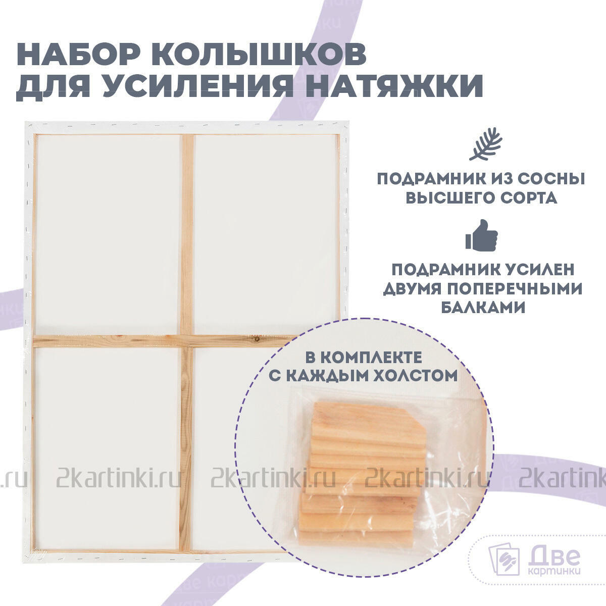 Холст натянут методом боковой натяжки на деревянный подрамник в жестком сборе. Материал холста 100% хлопок. Грунтовка акриловая 380 грамм на метр квадратный. Подрамник из дерева сосны высшего сорта. Холст на подрамнике подходит для акриловой живописи.