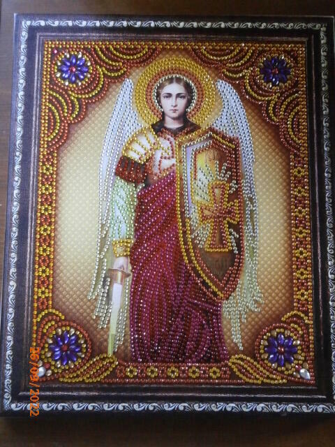 Здравствуйте, делюсь с вами ещё одной оконченной работы Алмазной вышивки Архистратиг Михаил, результат получился блестящим, как окончила работу, сразу приступила делать Воскресение Христово, удовольствие растягиваю, так как делаю по два рядка.