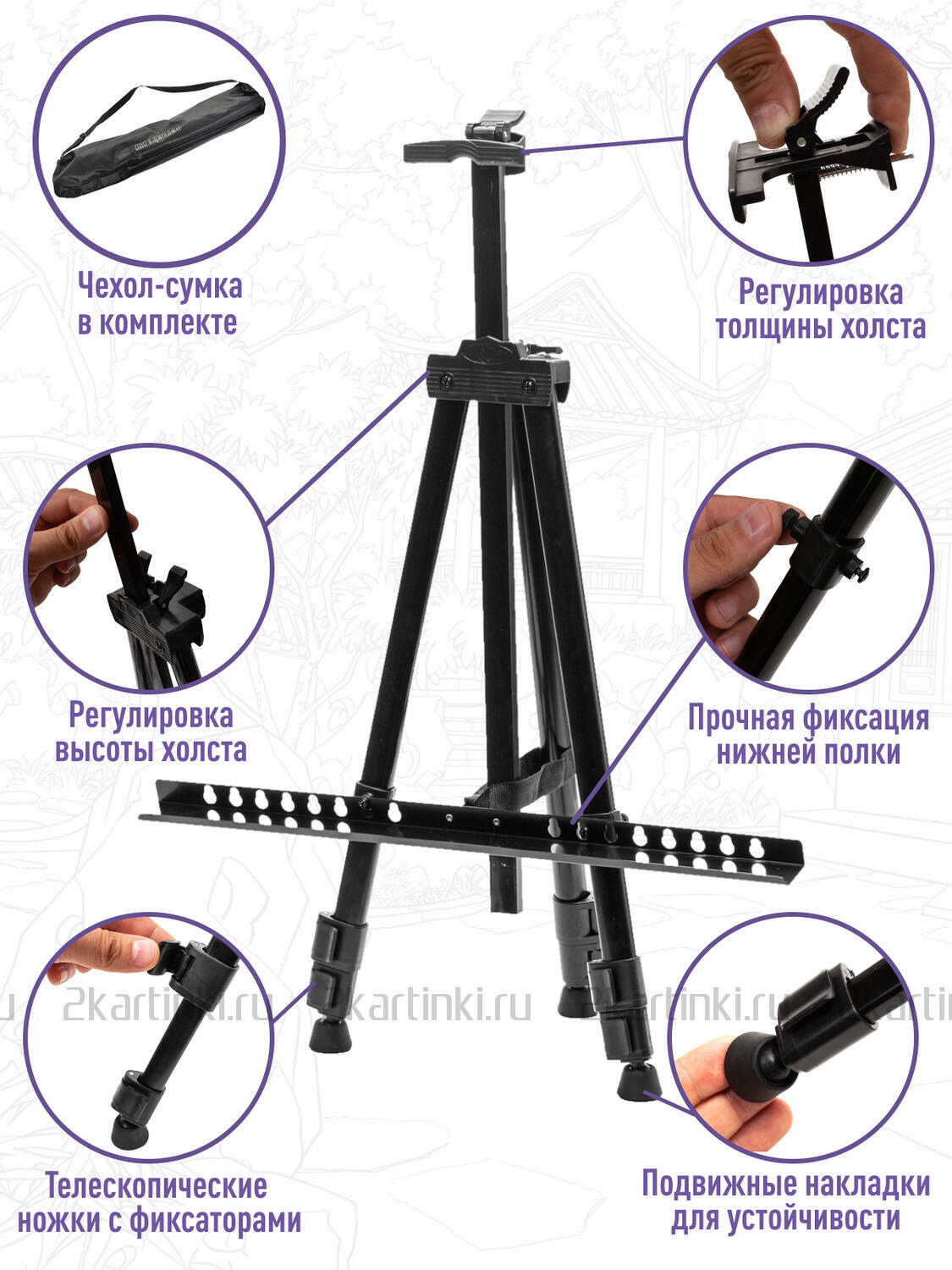 Данный мольберт подходит для рисования картин всех размеров из нашего каталога. Поставляется в удобном чехле, в сложенном виде. Используется рекламными агентствами, на выставках искусства/картин, фото-выставках, удобная подставка для планшета или табличек-указателей.