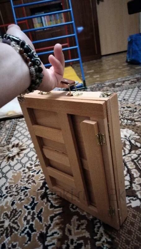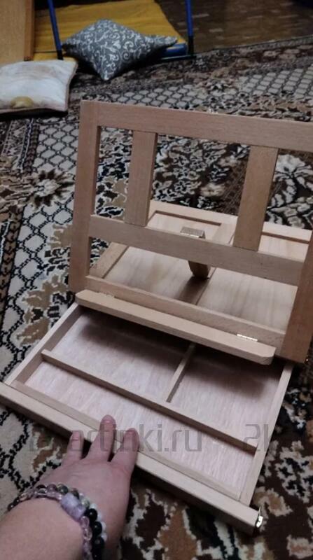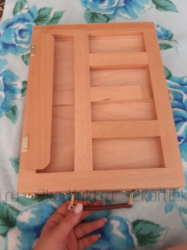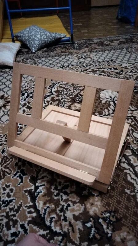 Выполнил из качественной древесины. Шлифовка идеальна. Удобный карман для красок и кистей, что даёт больше места на столе и сохранить порядок.